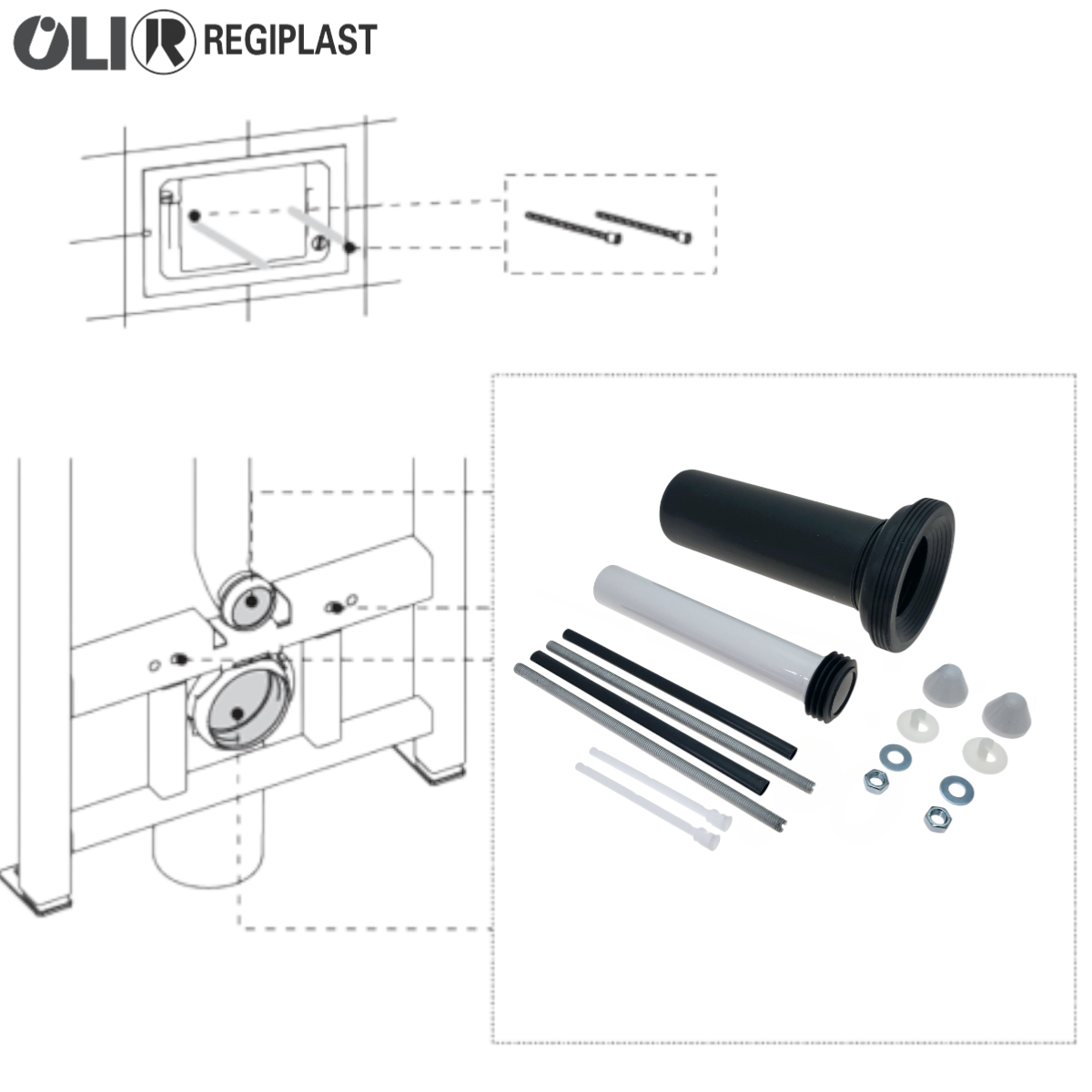 Kit de raccordement pour toilettes suspendues :  Manchon Ø90 x Ø125 x 300, joint Ø125, raccord Ø45 x 280, joint Ø45, tiges filetées M12 x 300, vis de fixation contre plaque, matériel de fixation pour toilettes.