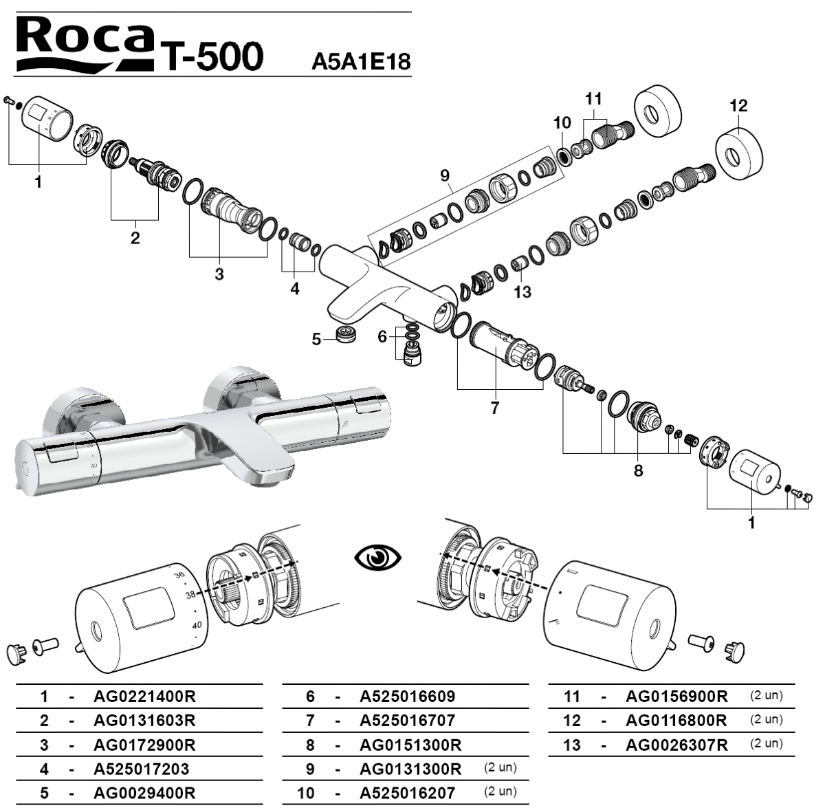 ROCA AG0221400R KIT POIGNEES MITIGEUR BAIN/DOUCHE THERMOSTATIQUE VICTORIA T-500.
